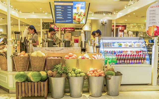 然后里面摆一个一米多长的吧台,备榨的水果尽量丰富一些,要做到应有尽有。