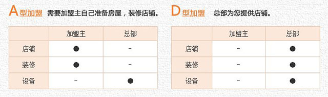 | 加盟商总投资 | 约60万元(不含店铺租赁费用) | 约35万元(不含店铺租赁费用) |