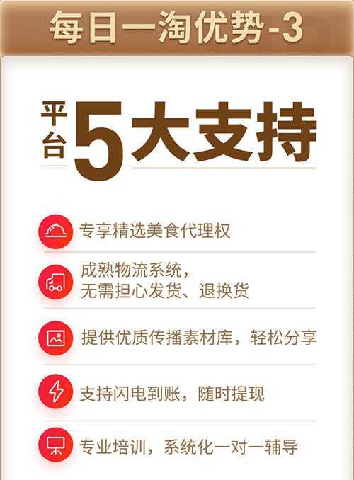 每日一淘致力于将每日优鲜背后的品牌、团队、技术和供应链资源共享,连接去中心化的社群,致力于帮助每一个有梦想的小创业个体提供创业大舞台。所以依托于每日一淘创业,能让我们最大程度地享受社交电商红利,更快速的赚钱和裂变团队。