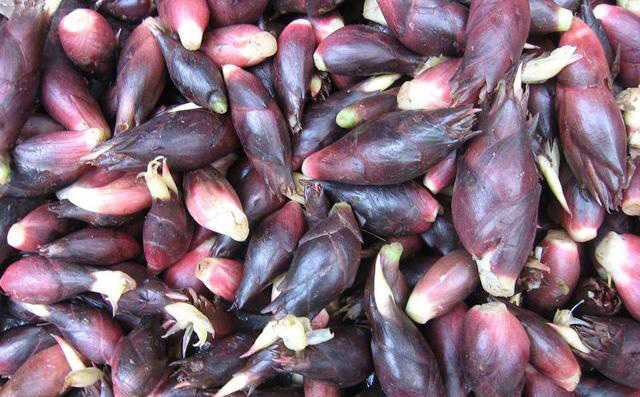 刚上市的蘘荷价格比较贵,三四十元/斤。外形像刚出土的竹笋,颜色呈紫红色,散发着一股特殊的清香,可吃可入药,味道独特。种植时病虫害较少,是一种天然的无公害食品。具有祛风止痛,消肿活血散瘀等功效,它的花序可治咳嗽,配生香榧治小儿百日咳有显效。