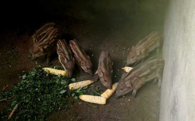 图为彭兴刚养殖的小野猪正在圈舍里吃食。