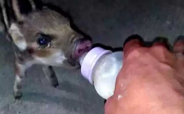 当时,家人都劝我放弃养野猪,说早点把剩余的野猪卖了还能减少些损失,但我心里就是有一种不想认输的劲,不想就这样放弃自己的梦想”。图为彭兴刚正在给一头小野猪喂奶。