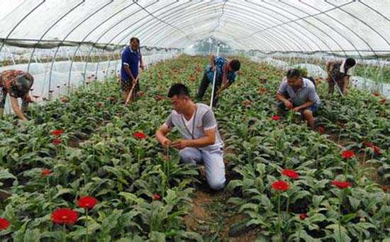 “我当时就心动了,决定回乡跟他一起搞花卉种植。”李细文回忆道,今年3月份,他投资了40多万元来打造他的花卉基地。他选择鑫东生态园旁边的一片荒芜多年的、20多亩的田地,按一年400元/亩的价格从村民手里流转过来,接着还搭建了45个钢架大棚。5月份开始,陆续种植了非洲菊、百合、黄英、玫瑰等4种高端花卉、几十个品种。